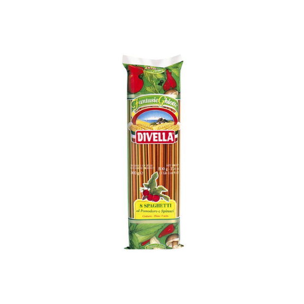 Divella 8 Spaghetti al Pomodoro e Spinaci Trójkolorowy makaron spaghetti (pomidory/szpinak). Jest idealny do zimnych sosów z warzywami i aromatycznymi ziołami . Doskonale nadaje się również do gorących sosów z dodatkiem czosnku i pieprzu. Doskonały do pomidorów i szpinaku. Wyprodukowany przez renomowaną firmę Divella, która przykłada szczególną troskę o jakość swoich produktów.