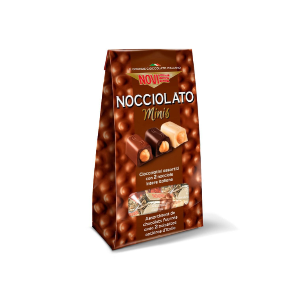 Praliny Novi z całymi orzechami laskowymi to znany i ceniony włoski przysmak. Przepyszny mix pralinek w trzech smakach: czekolada z giandują i orzechami laskowymi 13%, czekolada ciemna z orzechami laskowymi 13%, czekolada biała z orzechami laskowymi. Każda pralinka jest oddzielnie pakowana.
