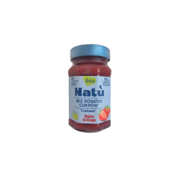 Dżem truskawkowy bio wytworzony w 95% z owoców pochodzących z ekologicznych upraw.