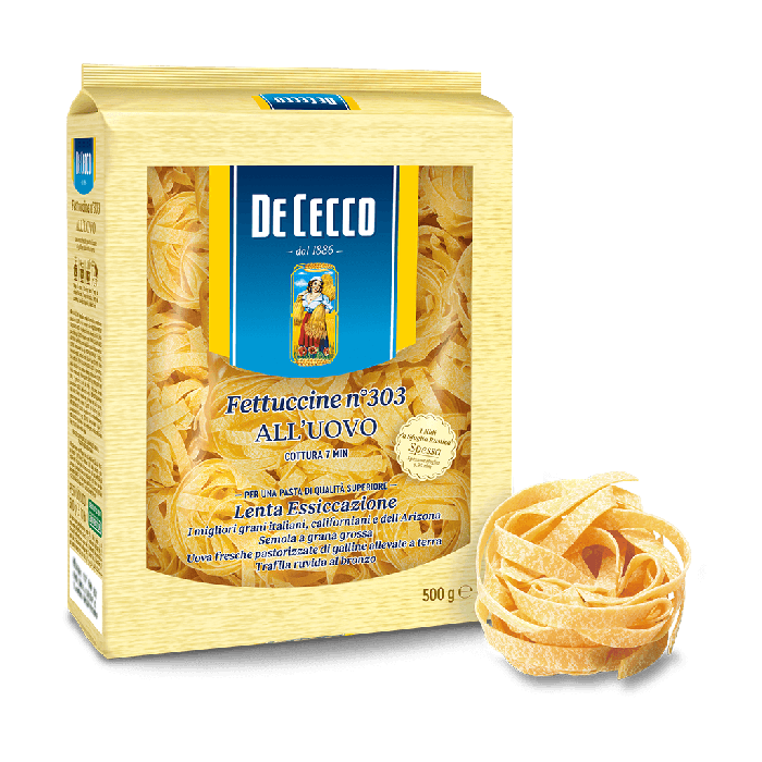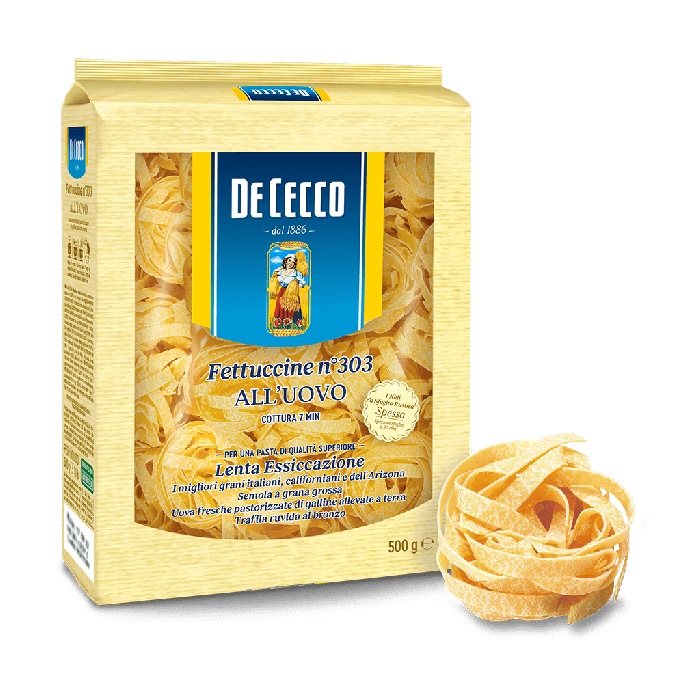 Fetuccine jajeczne 500g - marki DE CECCO. Fettucine należy do rodziny długich, płaskich makaronów. Nie jest łatwo ustalić, skąd pochodzi ten rodzaj makaronu, który jest popularny w całych Włoszech, choć pod różnymi lokalnymi nazwami. Fettucine pochodziły prawdopodobnie z Lacjum, gdzie są dumą całej kuchni regionalnej.