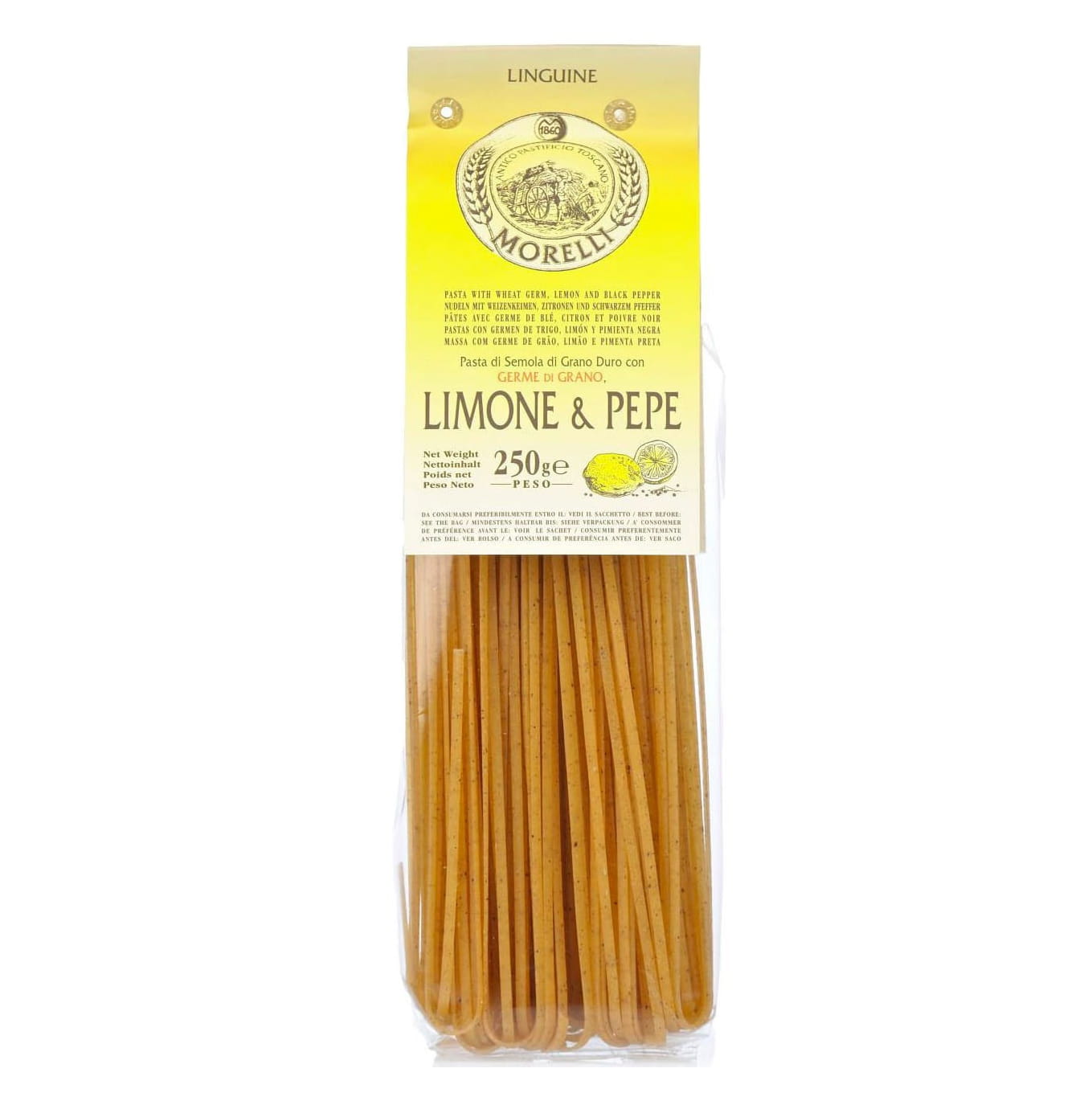 Linguine Limone e Pepe z kiełkami pszenicy to tradycyjny makaronu o długim i płaskim kształcie przypominającym wstążki. Wyjątkowego charakteru i aromatu dodaje mu skórka z cytryny i pieprz, dzięki czemu staje się idealnym towarzyszem dań na bazie ryb i sosów. Wystarczy zaledwie delikatne skropienie oliwą, aby poznać jego wyjątkowy charakter.