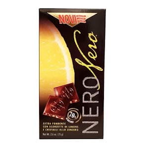 Elegancka ciemna czekolada Novi Nero Nero zawiera 70% kakao. Wzbogacono ją o skórkę cytrynową i – czego przed oraz w trakcie degustacji nie wiedziałam – kryształki cukru imbirowego. Pomimo tego, że tabliczka znajduje się w kartoniku o tradycyjnym rozmiarze, waży tylko 75 g.