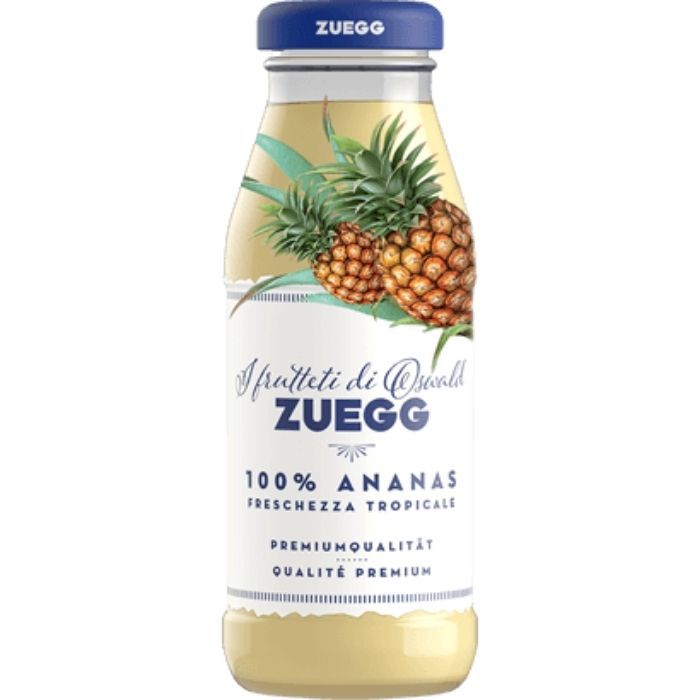 Sok z ananasa 100% włoskiej marki Zuegg w szklanej butelce. Dzięki najlepszym owocom zebranym, wyselekcjonowanym i przetworzonym ze szczególną uwagą i miłością Zuegg oddaje w ręce klientów wyjątkowe soki. Goszczą one często w najlepszych barach i restauracjach w całych Włoszech. Sekretem Zuegg jest ekskluzywny smak bez aromatów, barwników i sztucznych substancji słodzących. Zuegg to firma rodzinna, którą tworzą ludzie i sady. Posiadanie przez firmę własnych sadów na północy i południu Włoch oznacza możliwość uprawy owoców w idealnych warunkach dla każdej odmiany. To właśnie różni soki Zuegg od innych.
